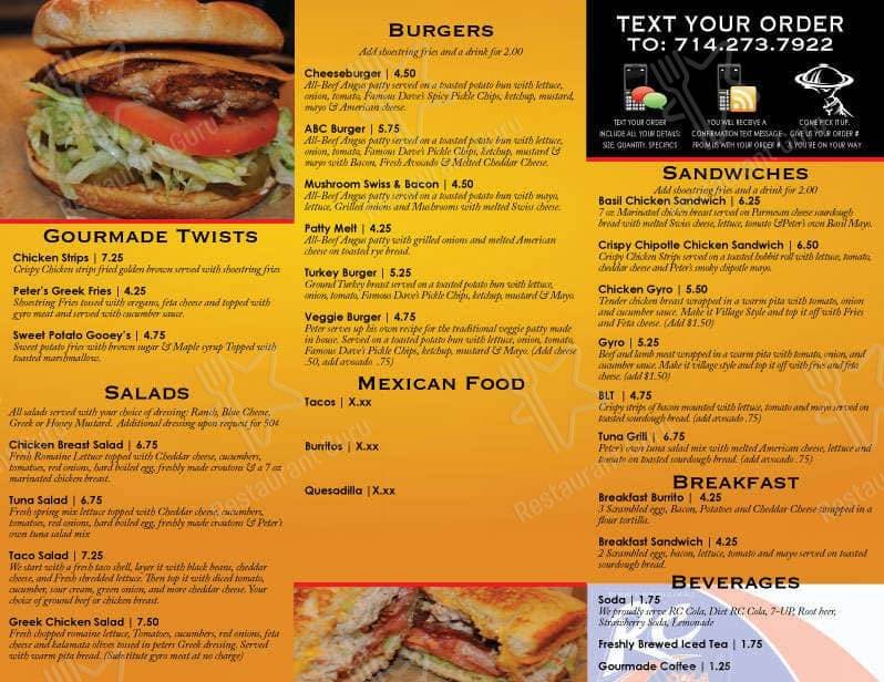 Welcome to Peter’s Gourmade Burgers, a Latinx-owned burger joint located in Tustin, CA. This gem offers a variety of options, including vegan and vegetarian choices, ensuring there's something for everyone. The casual setting with friendly staff provides a welcoming atmosphere for customers. The menu boasts juicy and delicious burgers, with standout options like the ABC burger and the mushroom burger. The fries are fried to perfection and the homemade ranch is a must-try. Customers rave about the flavors, quality, and filling portions of the meals. With options for takeout, delivery, and catering, Peter's Gourmade Burgers is a must-visit spot for burger enthusiasts looking for a memorable dining experience.